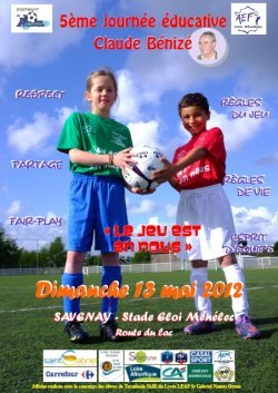 Bonjour à tous, Ce dimanche 13 mai 2012, le District de Loire-Atlantique de Football organise en partenariat avec l’Amicale des Educateurs et le club du Groupement de Jeunes de l’AS du Sillon (Savenay - Prinquiau), au Stade Eloi Ménélec, Route du Lac à Savenay, la 5ème édition de la Journée Educative des U11 - Claude BENIZE, « Je suis Exemplaire ». Cette journée a pour objectif de : Mettre en valeur le Football d’animation et tous ses pratiquants par le jeu (formes de pratiques diversifiées) et les différents ateliers ludiques et techniques ! Près de 560 p’tit(e)s footeux en herbe sont attendus, représentant 56 clubs Labellisés du District 44, afin d’honorer sa mémoire. Les jeunes filles auront l'honneur de clôturer cette manifestation en participant au Festi-Foot, dans le cadre de la promotion du football féminin. Journée de la Solidarité : Important ! Un stand sera à la disposition de chaque participant (petit et grand), afin d’y déposer un jouet ou un jeu au profit de l’association « Les Amis des Enfants du Monde». Ils seront vendus lors d’une foire aux jouets, l’argent récolté servira à financer leurs actions. Il serait bien que chacun de nous, fasse un geste pour eux ! Venez nombreux les encourager... Pour plus d'information, consulter la "newesletter : Foot Anim’ AOSP ! L'éqipe éducative.
