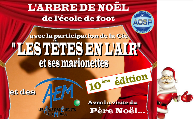 L’Arbre de Noël de l’AOSP se déroulera le samedi 6 janvier 2018 à 16h30 à la salle de la Boule d’Or à Pont-Château en raison de courses de cyclo-cross. Pour fêter la 10ème édition, le Comité d’Administration a fait appel à " la Cie La tête en l’air " qui présentera un spectacle dénommé " Loup y es tu ? ". Une scène assurément drôle, pour toute la famille qui mélange astucieusement théâtre et marionnettes.