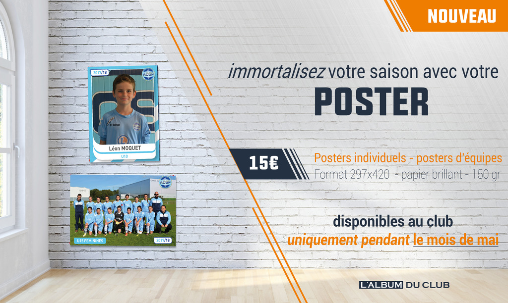 Le Conseil d’Administration de l’AOSP propose à chacun de ses licenciés d’immortaliser la saison en leur proposant son poster individuel et le poster de son équipe (les photos de Mon Album).