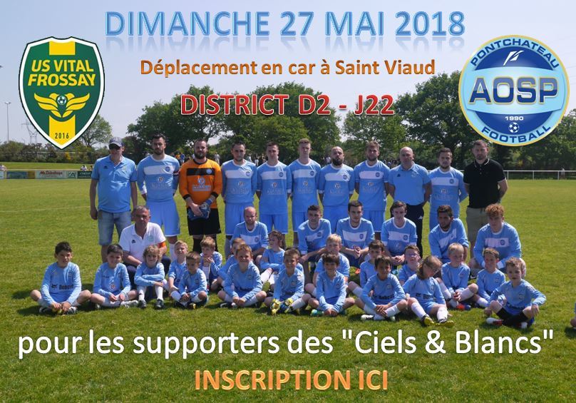Le club de l’AOS PONTCHATEAU organise un transport pour ses supporters, le dimanche 27 mai, afin d'assister à la dernière rencontre de championnat de D2, à Saint Viaud, entre l'US VITAL FROSSAY et l'équipe fanion des seniors de l'AOSP.