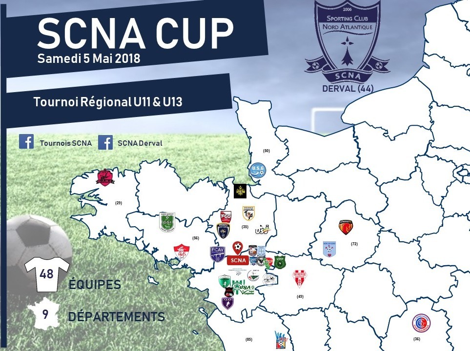 Le Sporting Club Nord Atlantique (SCNA Derval) organise un tournoi national pour la catégorie U12 les samedi 18 et dimanche 19 mai prochain. A cette occasion, les "Ciels & Blancs" seront présents sur les rectangles verts de Derval pour en découdre avec un panel d’équipes trié sur le volet.