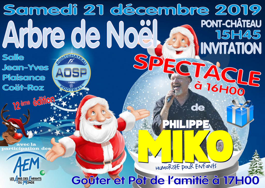 L’Arbre de Noël de l’AOSP se déroulera le samedi 21 décembre 2019 à 15h45 à la salle Jean-Yves Plaisance – Coët-Roz à Pont-Château.